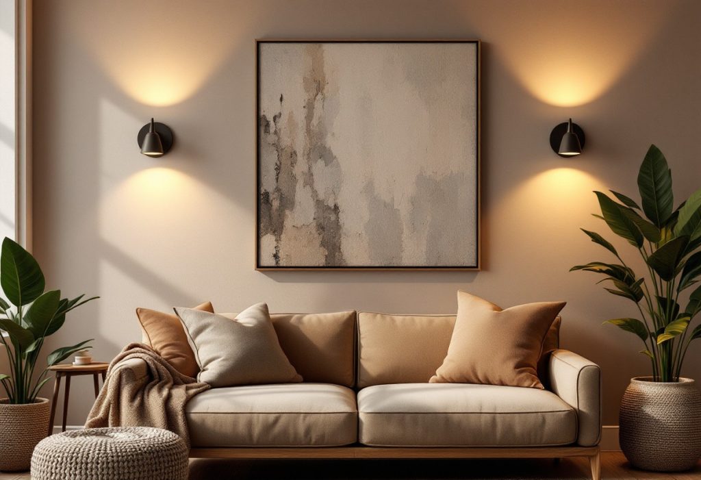 Pour le salon, les appliques murales constituent souvent un choix judicieux. Leur éclairage indirect crée une ambiance chaleureuse et conviviale. De plus, elles peuvent être placées de manière stratégique pour souligner des éléments comme un tableau ou une cheminée.
