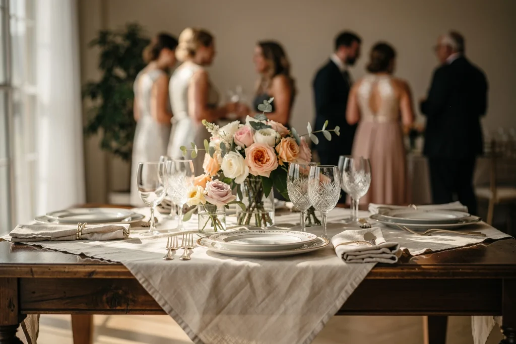 L’élégance d’une réception légère naît aussi de l’ambiance créée. Un éclairage tamisé, quelques compositions florales et des musiques bien choisies suffisent souvent à transformer n’importe quelle salle banale en espace festif et sophistiqué.