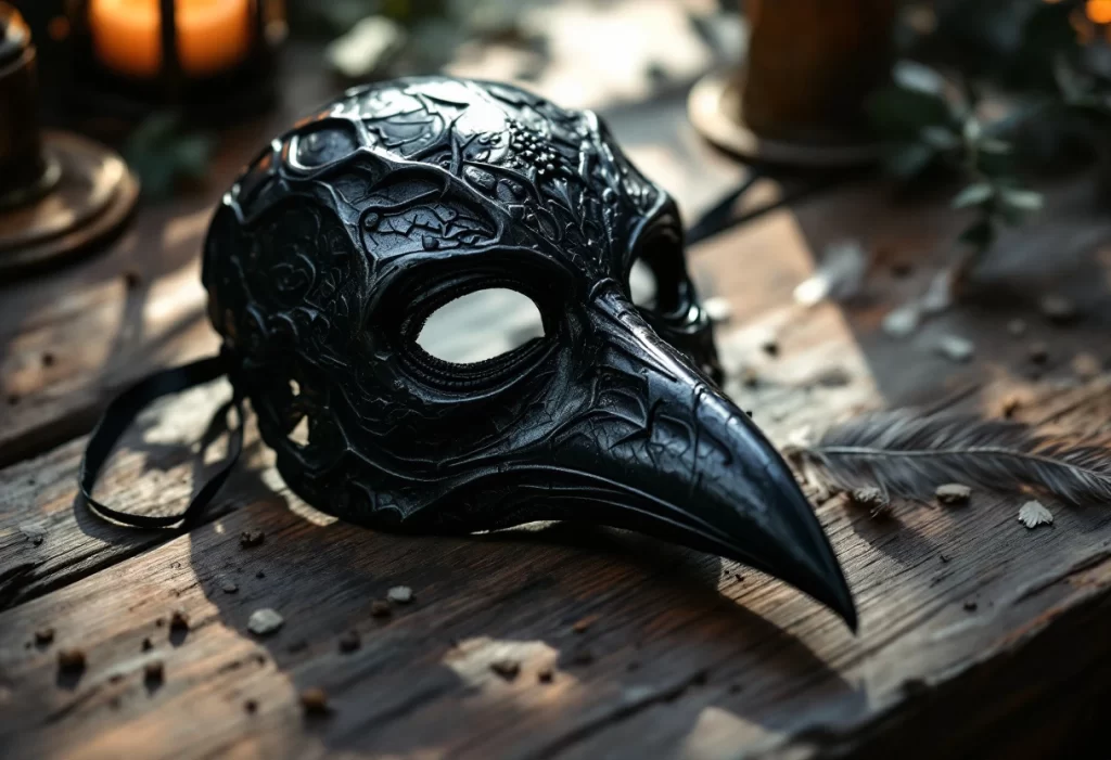 La fabrication du masque influence fortement la réflexion et l’absorption de la lumière. Un masque corbeau en papier mâché diffusera une lumière douce, idéale pour créer des lignes subtiles dans les ombres portées. À l’inverse, un modèle en cuir ou en plastique réfléchira davantage la lumière, générant des contrastes prononcés et des zones d’ombre nette.